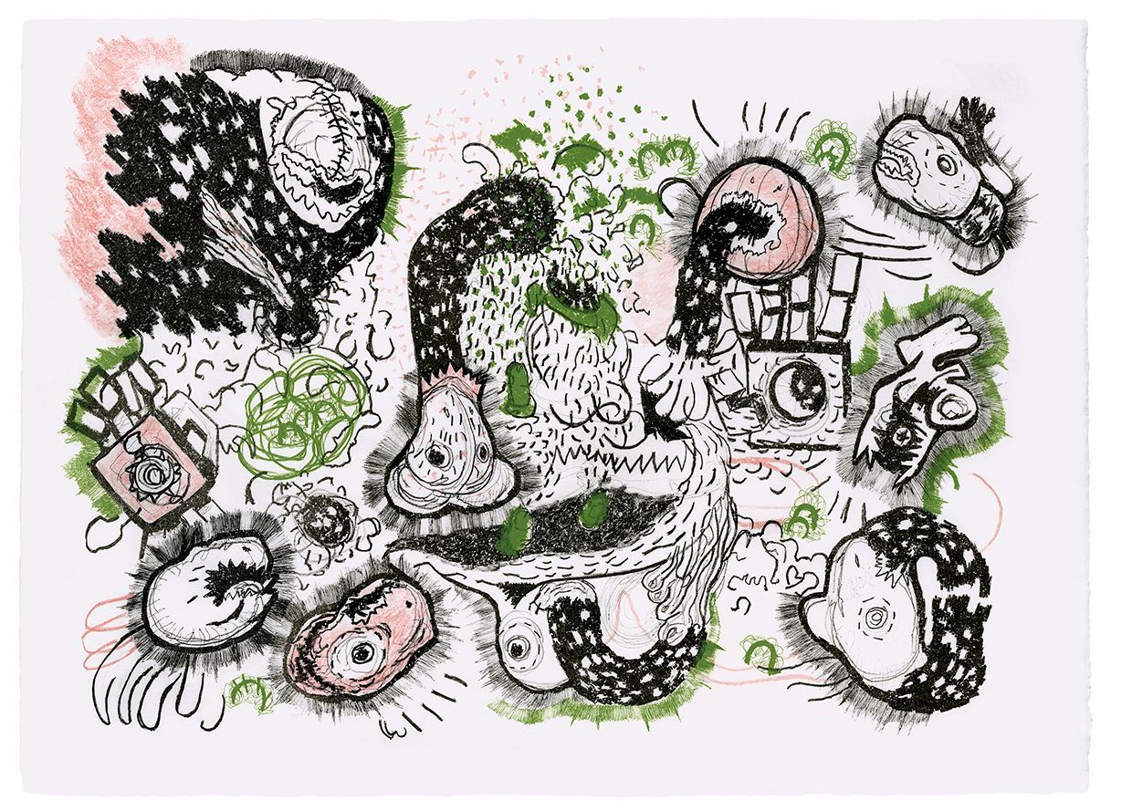 Offsetdruck und Tuschezeichnung gehen hierbei in der Druckgraphik eine Verbindung ein. In einigen Arbeiten findet auch die Collage Einzug. Mit Spannung verbinden sich dabei Vor- und Hintergrund der bedruckten Papierflächen. Die Objekte werden in kleinsten Abschnitten auf das Papier aufgebracht und besitzen durch das Weitertreiben eine ungegenständliche bis hin zu abstrakten Anmutung.