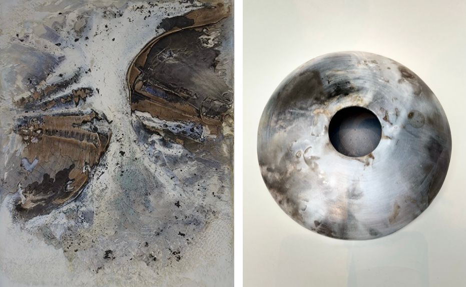 Beatrice Gunschera, Keramikerin, und Uschi Zeidler, Malerin und Bildhauerin, nutzen in ihren gestalterischen Prozessen die Reaktion der verwendeten Materialien miteinander. Beatrice Gunschera unter Einwirkung der Glut des Feuers, Uschi Zeidler im Dialog mit den Trocknungsprozessen von Strukturmassen.