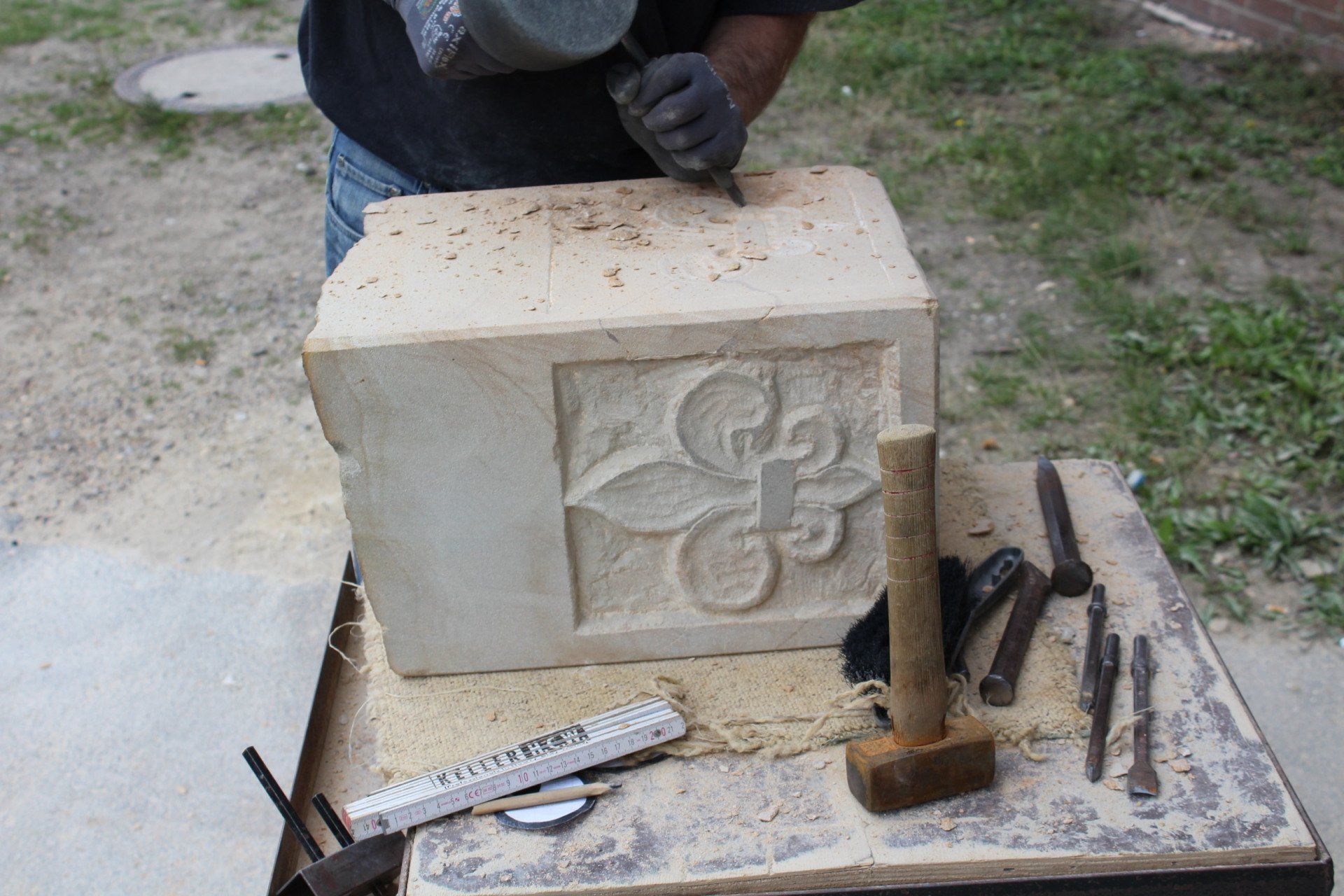 Unter fachkundiger Anleitung von Lucas Probst, sandsteinerfahren, können die Teilnehmer Ihren eigenen Sandstein schlagen. Wer schon immer eine kleine Stele mit seinem Namenszug im Vorgarten haben wollte oder aber ein anderes kleines Schmuck-Objekt bearbeiten möchte, ist in diesem Kurs genau richtig. Lucas Probst kennt die Tipps und Tricks im Steinmetzhandwerk und leitet die Teilnehmer versiert an; Kursneulinge sind ausdrücklich willkommen, für den Anfang sollte das Erstlingswerk jedoch realistisch an einem Wochenende umzusetzen sein.